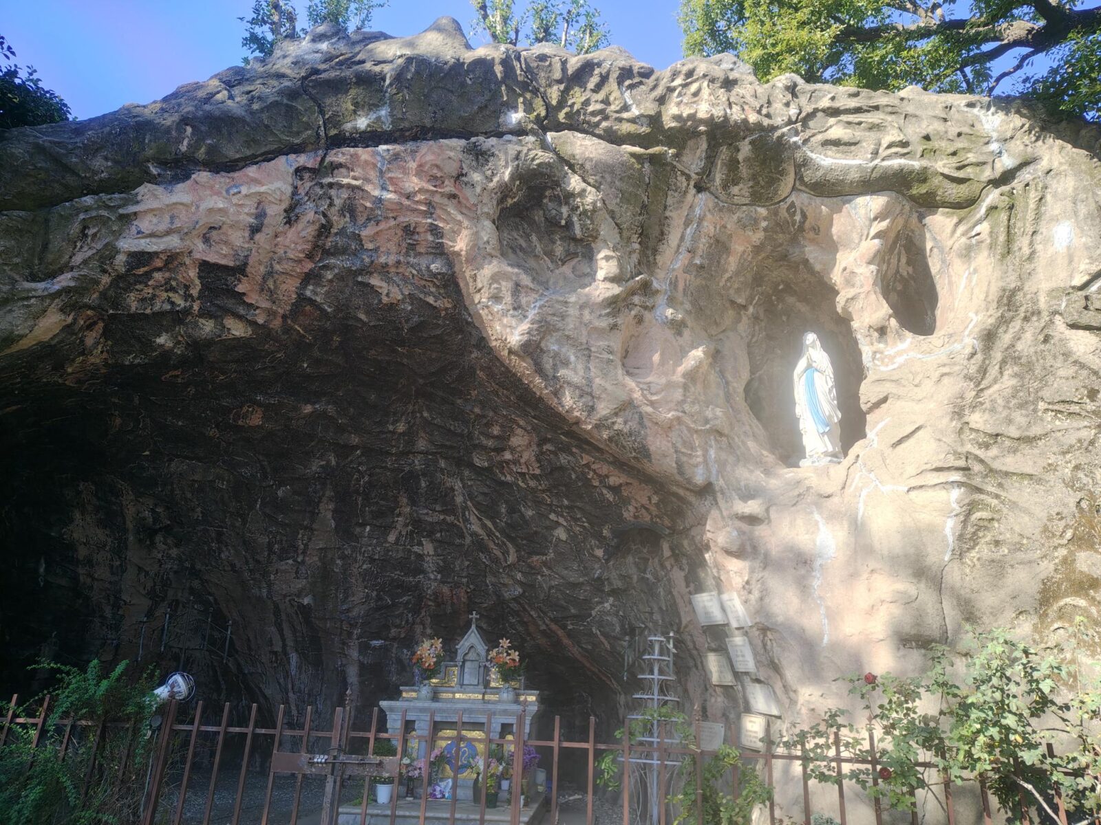 この教会の敷地内にあるのが、フランスのルルドの泉を模して作られた岩窟で、駐車場を挟んで向かい側にありました。